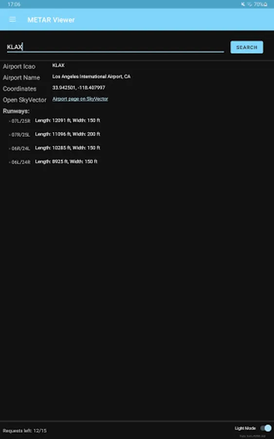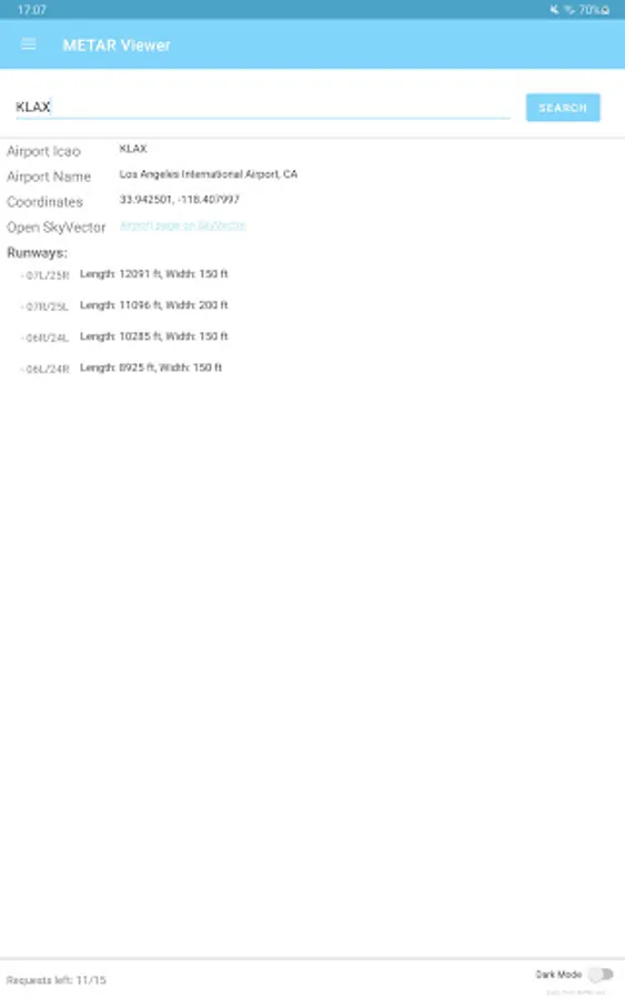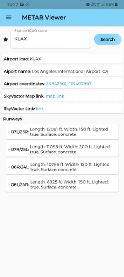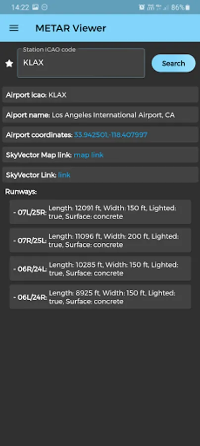 - Airport info (Name, Coordinates, Runways, SkyVector link)