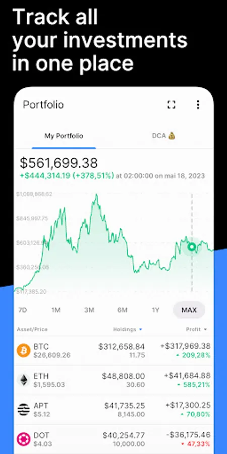 Organize all your crypto investments in one place. Simply enter your trades, and our app handles the rest — providing a clear overview of your assets, profits, and losses. Visualize the evolution of your portfolio value over time and keep your investments on track.