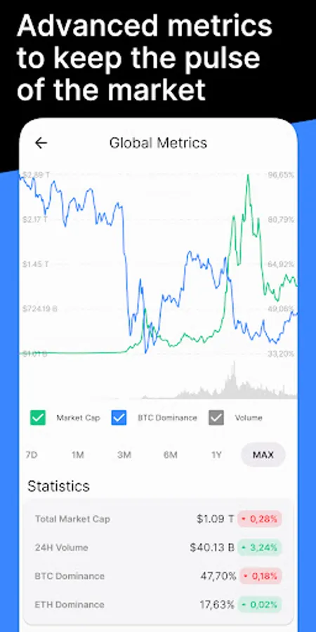 Our app provides global market metrics, giving you a bigger picture of the crypto market evolution and trends.