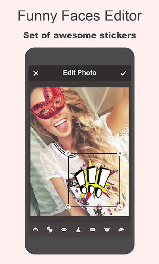 - Select stickers from different categories: Mouths, Nose, Hair, mustaches, beards, wigs, goggle, suit, body, Eyes and Hats etc.