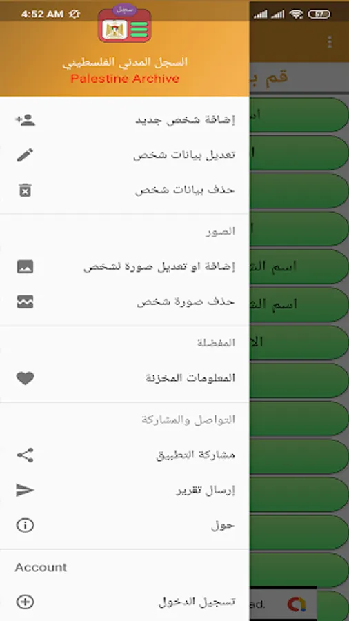 يحتوي تطبيق السجل المدني الفلسطيني على معلومات عامة عن سكان فلسطين مثل الاسم ومكان السكن وتاريخ الميلاد ورقم الهوية ومعلومات اخرى...وتم تطوير هذا التطبيق من اجل تسهيل عملية البحث عن البيانات وبحجم صغير جدا ويعمل على جميع اجهزة الأندرويد بالإضافة الى مميزات تم إضافتها حديثاً مثل إمكانية إضافة بيانات جديدة للأشخاص بشكل فوري في حال عدم وجود تطابق وإمكانية تعديل البيانات لأي شخص وابضاً تم إضافة ميزة الحذف الفوري للبيانات حيث يمكنك حذف معلومات شخص واحد فقط وايضاً تم إضافة ميزة رفع صورة لأي شخص داخل التطبيق حيث يمكن حذف وتعديل الصورة بشكل فوري في أي وقت.