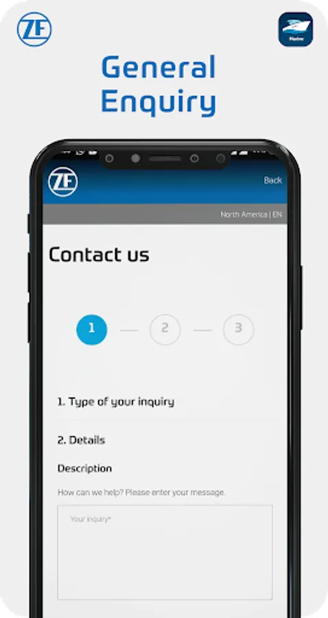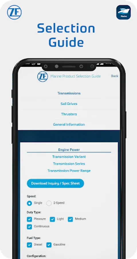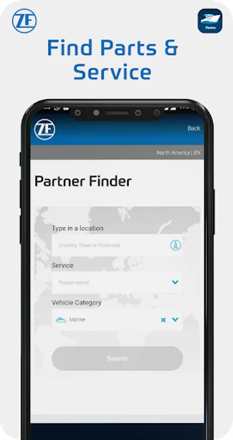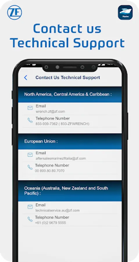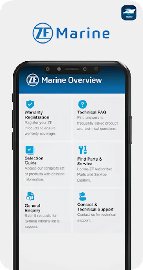 The ZF Marine App provides customers with ZF Marine Propulsion products useful links and product information including:Warranty Registration – Register your ZF Products to ensure warranty coverage.Technical FAQ – Find answers to frequently asked product and technical questions.Selection Guide – Access our complete list of products, specifications, installation drawings and other information.Find Parts & Service – Locate ZF Authorized Parts and Service Dealers.General Inquiry – Submit requests for general information or support. Technical Support – Contact us for technical support.