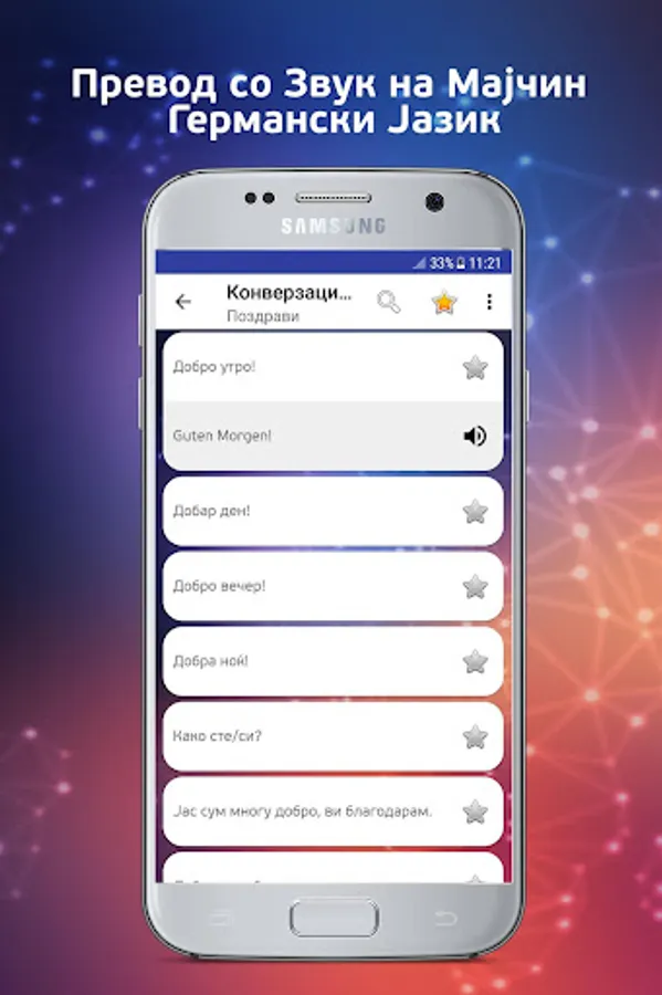 • Кликнете на саканата фраза или термин на Македонски јазик за да го добиете преводот на Германски јазик кој имате можност истовремено да ја/го слушате на Германски јазик за да го слушнете точниот изговор