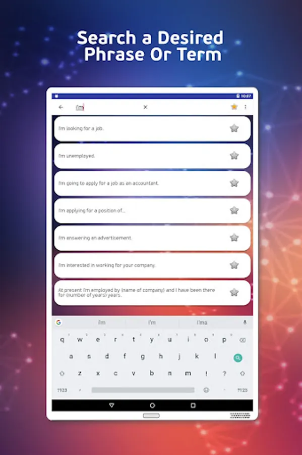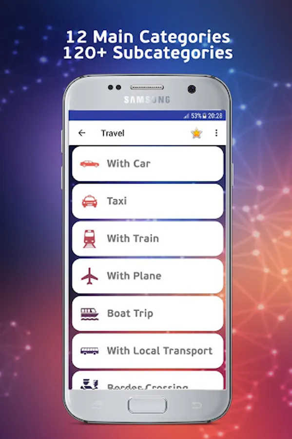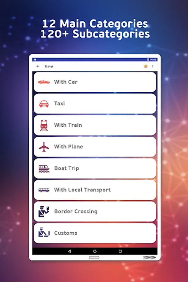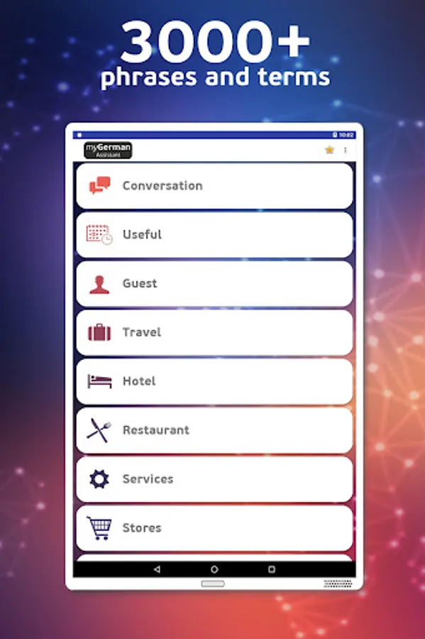 My German assistant contains over 3000 phrases and terms that are classified into 12 Main Categories which contains related Subcategories that make it easier to navigate in the application.