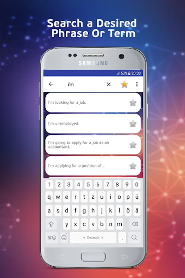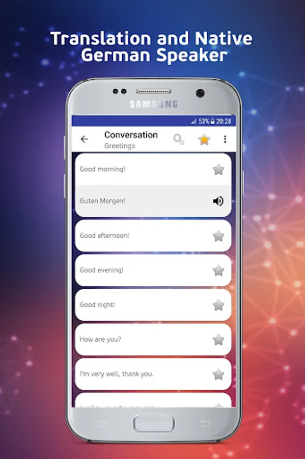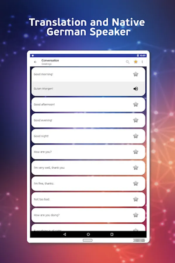 • Select the desired phrase in English to get the translation which is simultaneous spoken in native German language to hear the correct pronunciation.