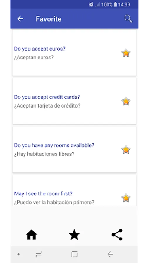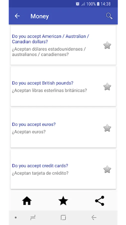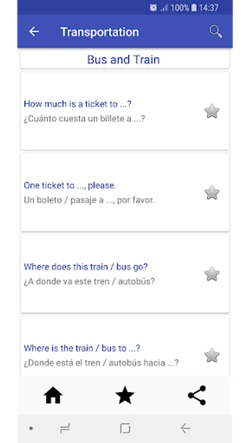 • Select the desired phrase in English to get the translation which is simultaneous spoken in native Spanish language to hear the correct pronunciation.