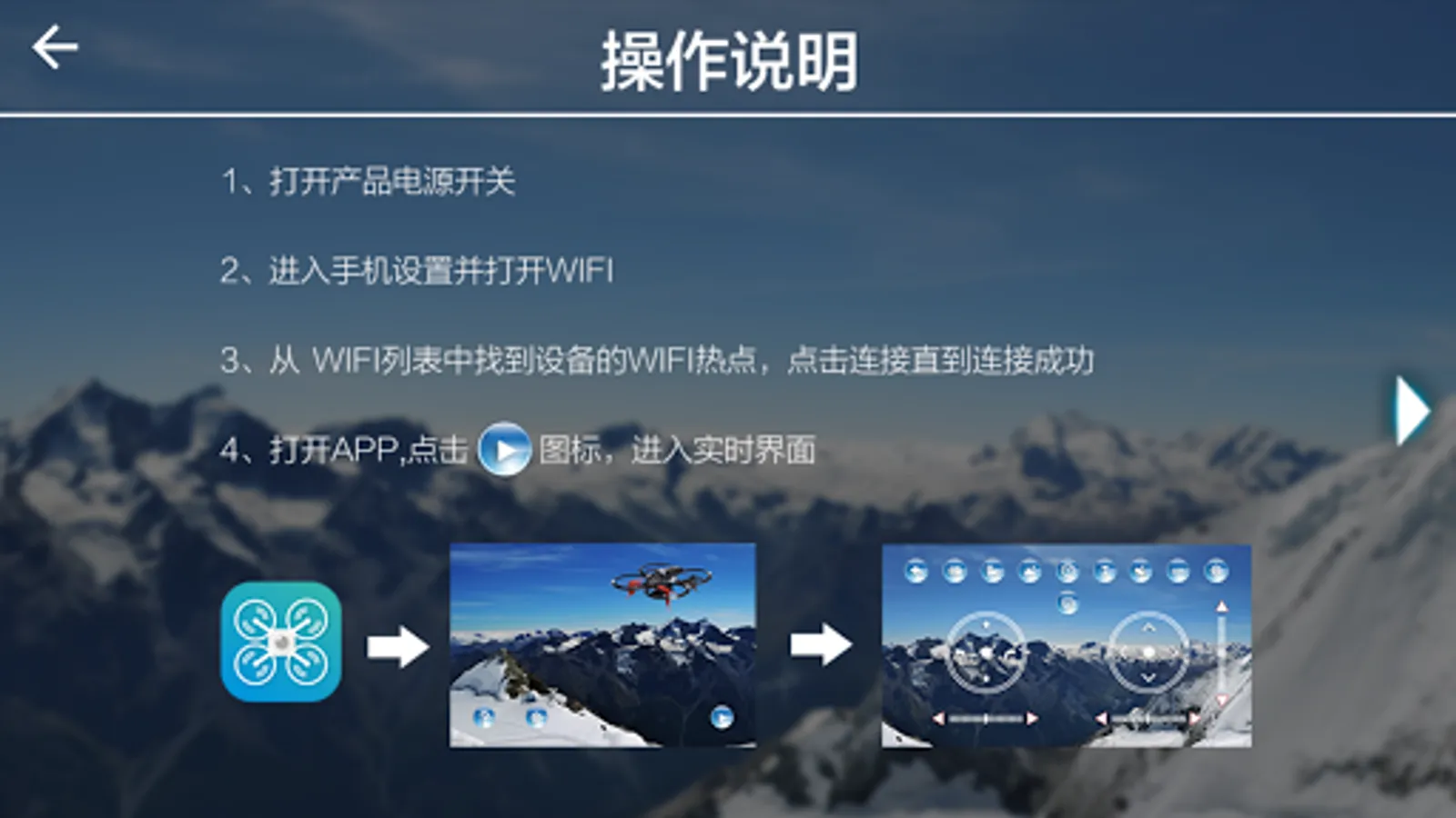 User could achieve FPV(First Person View) control between cell phones or PADs and drones through Wi-Fi. USer could see video in the cell phones or PADs, which is transmitted from the camera in drone through Wi-Fi, meanwhile, user could control the drone by operating either cell phone (PAD) or other remute controller, and save video records in the TF cards or cell phones or PADs is optional.
