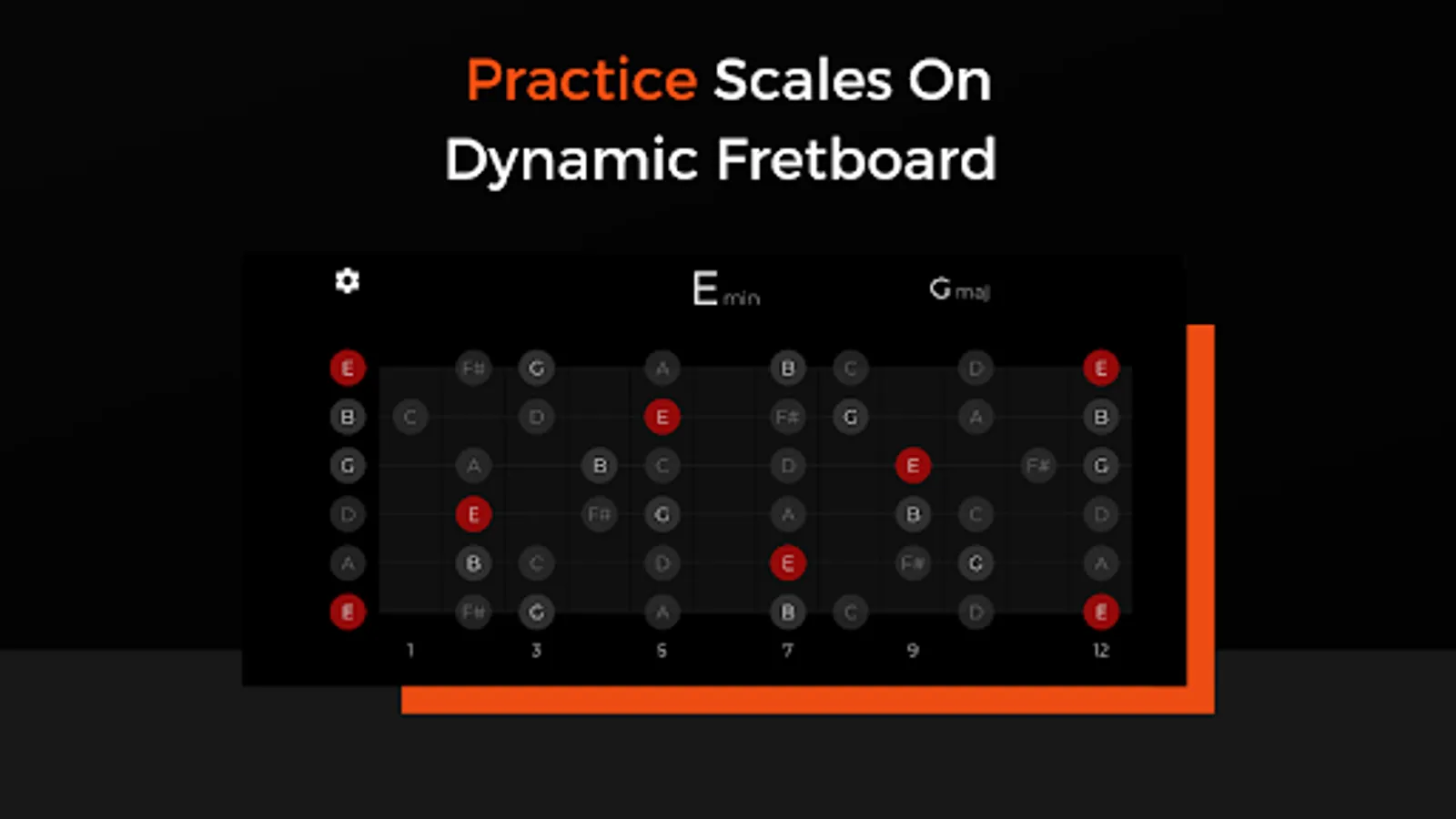You can also see the notes of the chord progression on a dynamic guitar fretboard. Select the key, scale and fret range and the notes will dynamically be highlighted according to the current chord. This significantly enhances your soloing skills and fretboard knowledge.