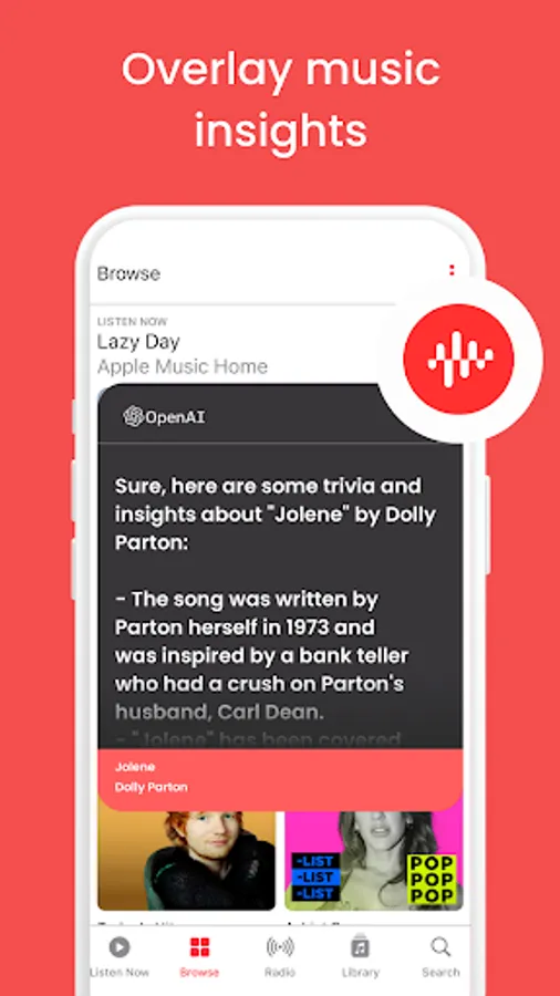 It works with any music app you use such as Spotify, TIDAL, Apple Music, Deezer, YouTube, etc. The App observes the phone's media notification to know the currently playing song and get insights from ChatGPT. The App act as a floating bubble that overlays the insights on your screen.