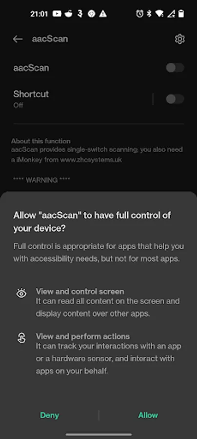 AAC-Scan is an assistive tool for disabled users with severe motor-problems. It provides an easy single switch scanning of your android device's UI interface using a point scanning system. With associated iMonkey hardware from ZHC systems, it provides fast row-column scanning of the device's screen with a single switch, head-nod or eye-blink. It is fast, accurate and simple to use.