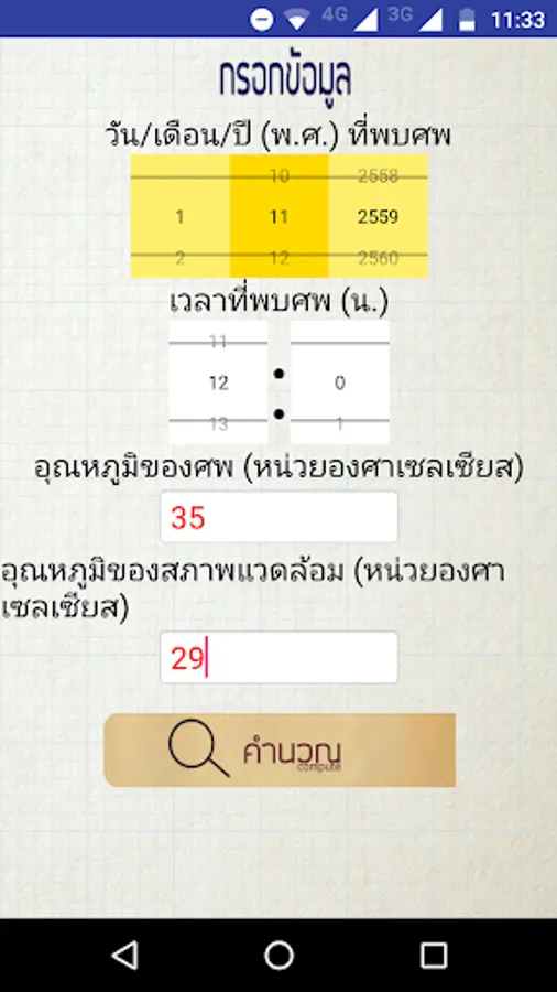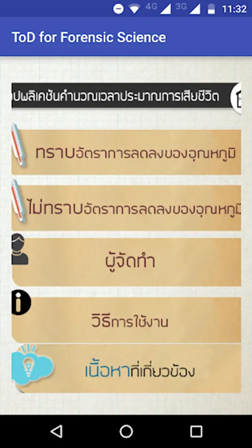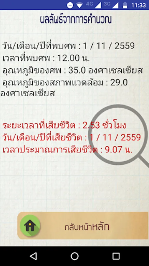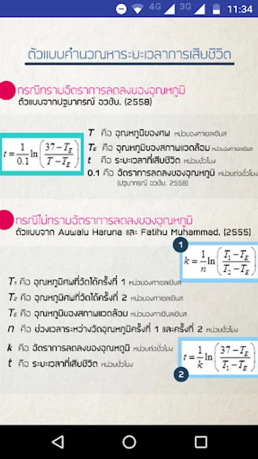 An application for an estimated time of death, which will be reported in the form of clock time and date of death. Developing an application has taken a long time to analyze the mortality data is used by the body temperature and the temperature of the environment. You can also learn more about the process of calculating the estimated time of death. How to keep your body temperature. Ambient temperature using thermometers in different ways. And math content Science related