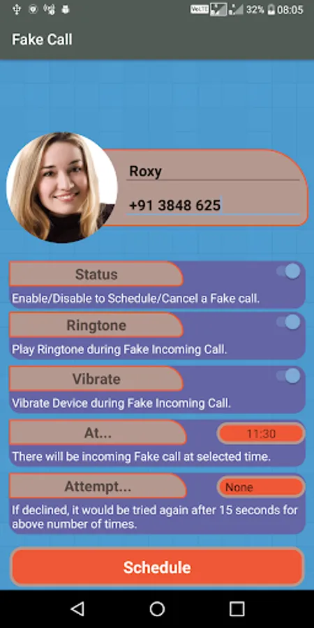Caught in unwanted situation? want to get out of unwanted conversation or discussion? Simply Schedule a Fake Incoming call and Phone will ring on scheduled time, it will look like real, say excuse me to your friends and you are out of unwanted situation.