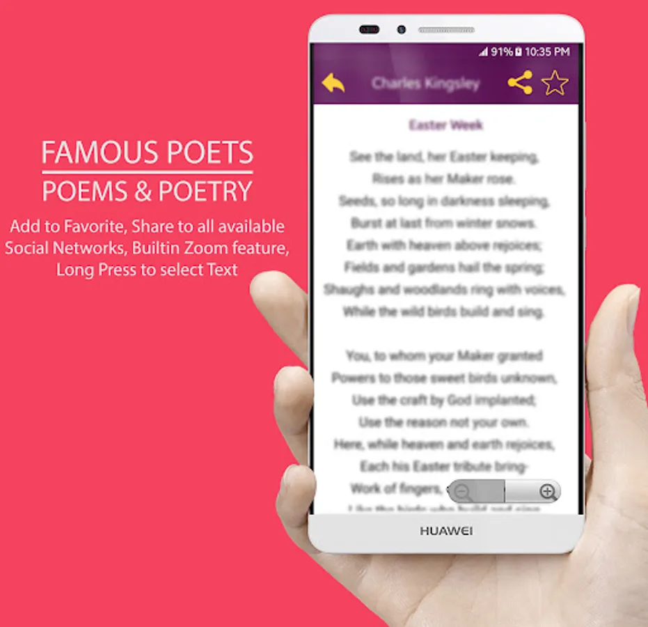 If you are in search of love, romance, friendship, inspiration, emotional, religious, patriotic, classic poems and poetry, this app provides thousand of the famous english poems from poets of all time from all over the world.