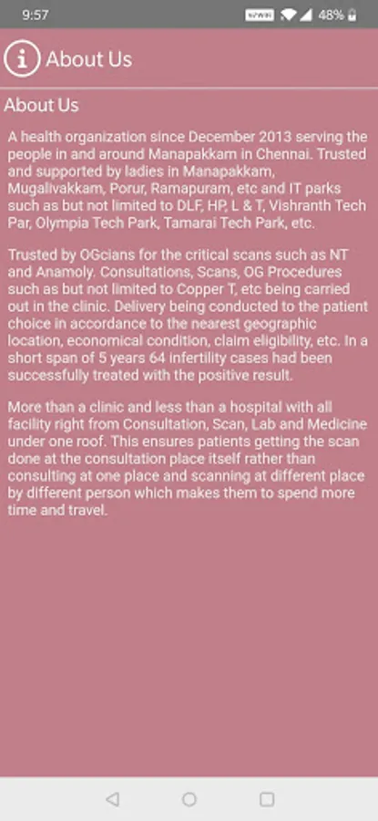 Trusted by OGcians for the critical scans such as NT and Anamoly. Consultations, Scans, OG Procedures such as but not limited to Copper T, etc being carried out in the clinic. Delivery being conducted to the patient choice in accordance to the nearest geographic location, economical condition, claim eligibility, etc. In a short span of 5 years 64 infertility cases had been successfully treated with the positive result.