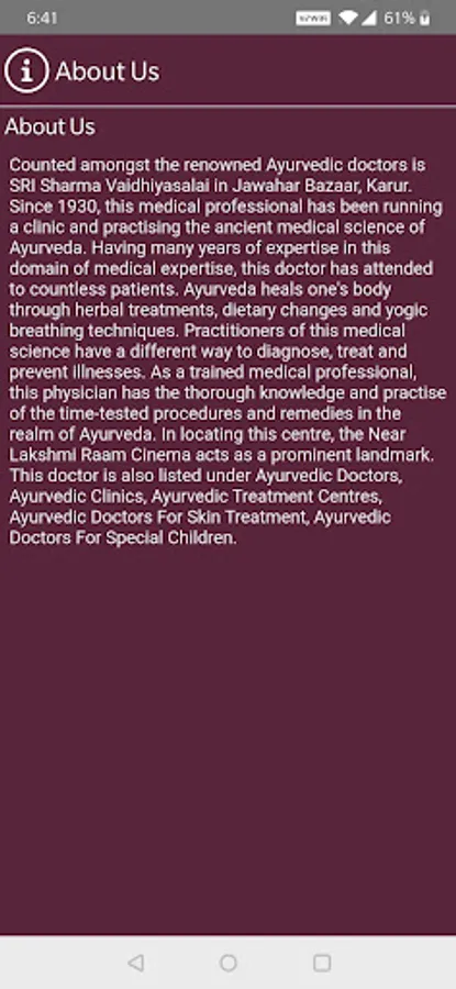 Counted amongst the renowned Ayurvedic doctors is SRI Sharma Vaidhiyasala in Jawahar Bazaar, Karur. Since 1930, this medical professional has been running a clinic and practicing the ancient medical science of Ayurveda. Having many years of expertise in this domain of medical expertise, this doctor has attended to countless patients. Ayurveda heals one's body through herbal treatments, dietary changes and yogic breathing techniques. Practitioners of this medical science have a different way to diagnose, treat and prevent illnesses. As a trained medical professional, this physician has the thorough knowledge and practice of the time-tested procedures and remedies in the realm of Ayurveda. In locating this centre, the Near Lakshmi Raam Cinema acts as a prominent landmark. This doctor is also listed under Ayurvedic Doctors, Ayurvedic Clinics, Ayurvedic Treatment Centres, Ayurvedic Doctors For Skin Treatment, Ayurvedic Doctors For Special Children.
