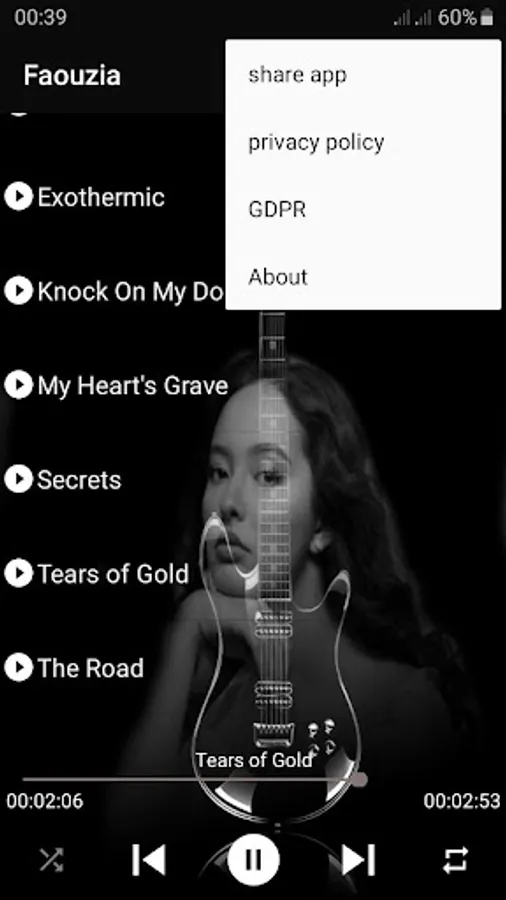 Une merveilleuse application pour le chanteur FAOUZIA sans Internet pour écouter et profiter des dernières chansons merveilleuses, vous pouvez également quitter l'application et écouter les chansons et même faire le statut de l'avion et continuer àcouter les plus avois bess chans Internet, vous pouvez également partager l'application avec des amis.