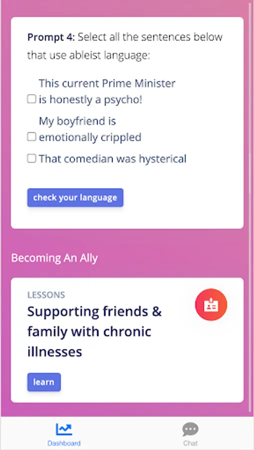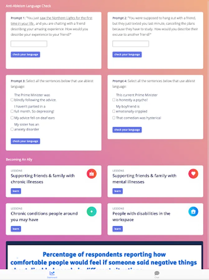 ZIAI is an AI bot designed to help users apply for accessible jobs, create inclusive institutions, learn about laws that protect disabled citizens, and work on themselves to be better allies. The AI is accompanied by an information page, where you can interactively work on making inclusive language a habit, read about supporting disabled loved ones, see data on ableism, and more. Primarily, ZIAI aims to create empathy, awareness, and understanding.