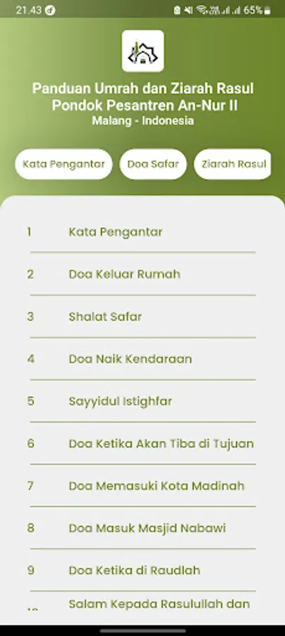 The Umrah Pilgrimage Application of the Prophet is a complete guide for performing Umrah worship and visiting holy places in the cities of Makkah and Medina along with the An-Nur II Malang Islamic Boarding School. With complete and easy-to-use features, this application will make it easier for you to plan Umrah and pilgrimage trips for Rasulullah SAW.