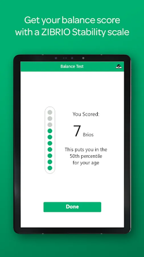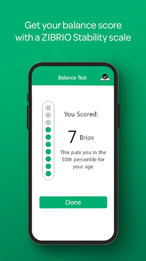 The ZIBRIO BalanceCoach® app connects to the ZIBRIO Stability scale via Bluetooth to sync as you stand for a quick 60-second balance test. You will see a countdown timer during the test. When the test is complete, the app will show your score and percentile. Your score determines your risk of falling in the next 12 months.
