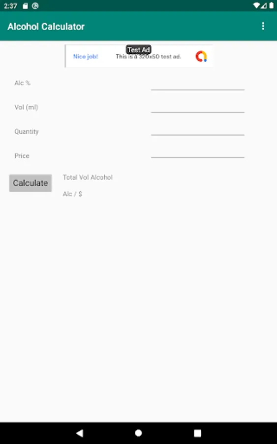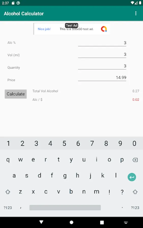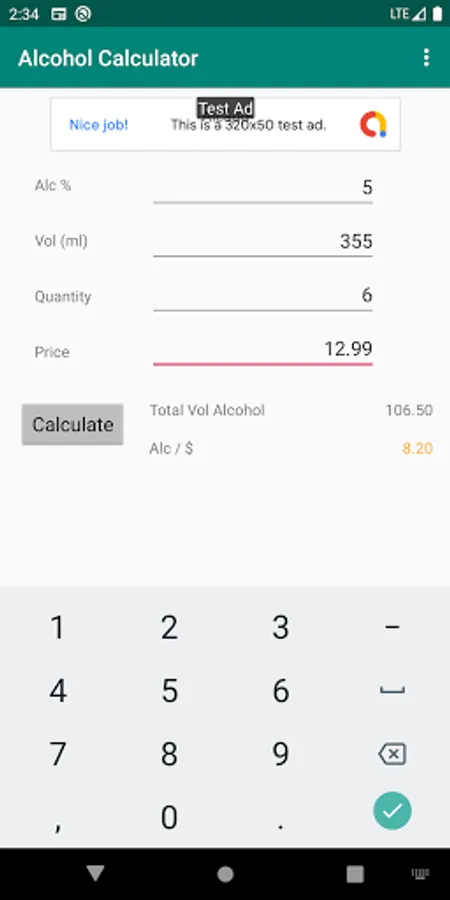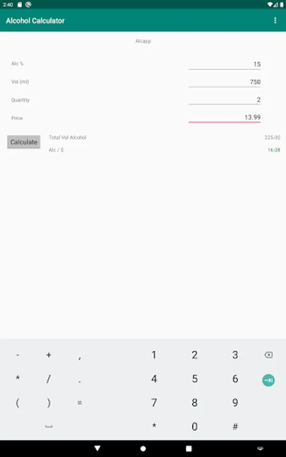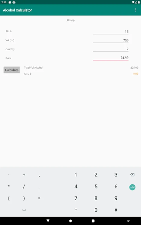 Use this app to determine which is a better deal while shopping for alcohol or protein. The app takes the percentage, volume per bottle, quantity of bottles and price and returns a metric which allows you to know which purchase will give you more actual alcohol content.