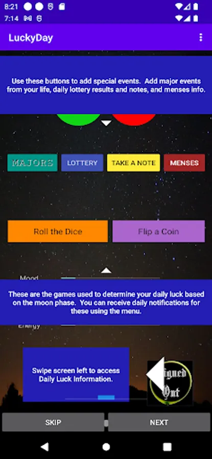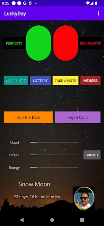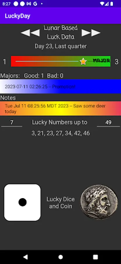 Use this app to track your luck as based on lunar activity. Anytime you are having a good moment or something good happens to you, hit the green button. If anything bad happens, tap the red button. The more the merrier so hit the buttons as often as you like. You can also track your lottery results and the algorithm will use all the data to determine when it's your LuckyDay!!