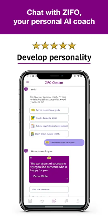 5. Zifo chatbot: ZIFO is our proprietary AI system which is one of the most advanced mental health or psychology platforms currently available. 🤗 It has success motivational quotes, poems, psychological assessments and information on mental health conditions. ZIFO helps people understand the causes, symptoms and treatment options available for psychology conditions like stress, anxiety and depression as well. 😇
