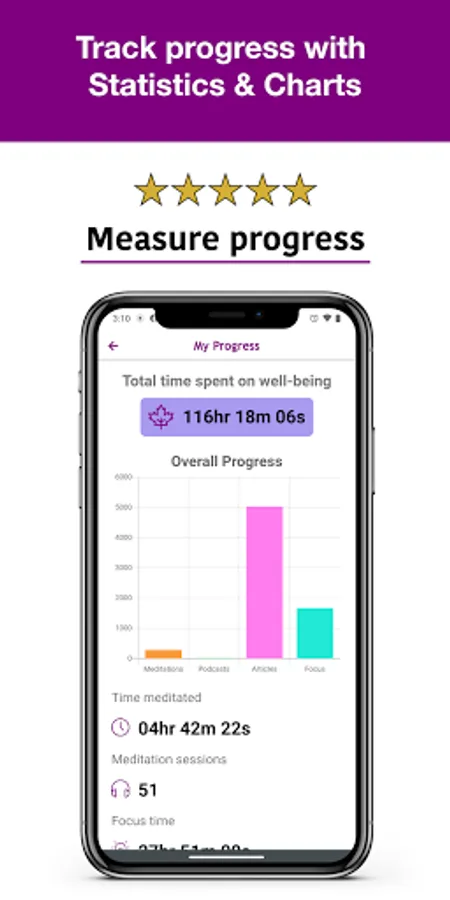 6. Statistics (progress): To successfully build any habit such as meditation, it is important to track progress. The statistics page helps track behaviour and take action where needed. Time spent reading articles on the Self Development feed or listening to relaxing music or doing meditation is shown using graphs and numbers!