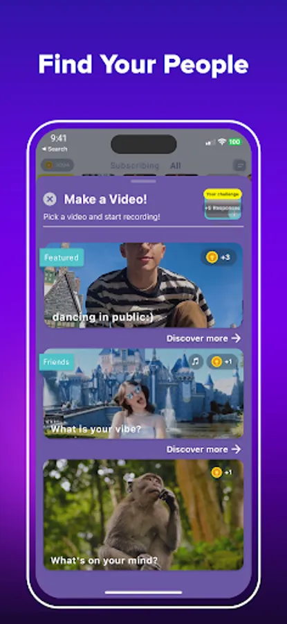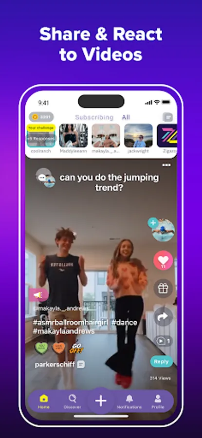 Unlike TikTok, Snapchat, Instagram, Youtube, and Likee, you can reply to videos with other videos — so it stays more real, safe, and authentic.