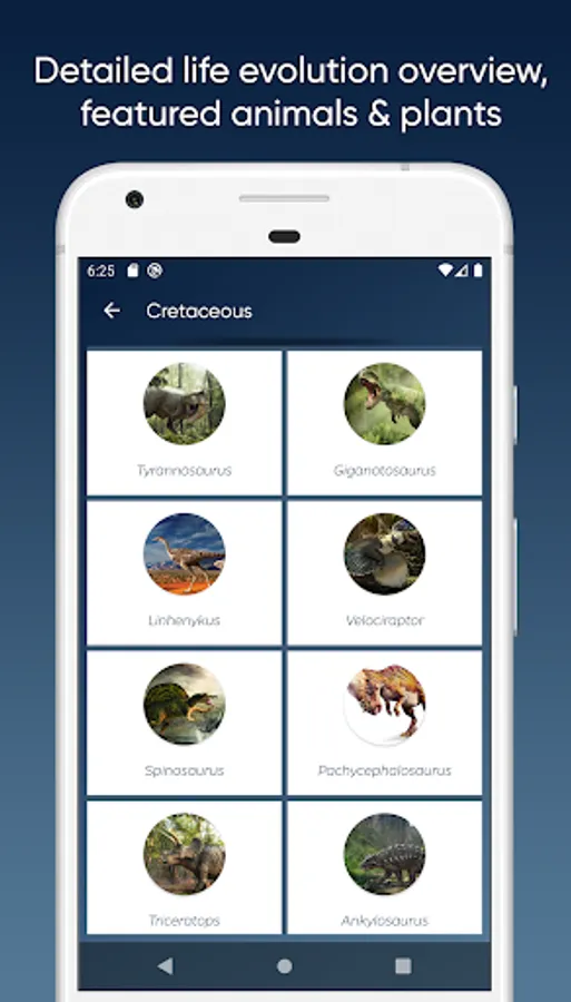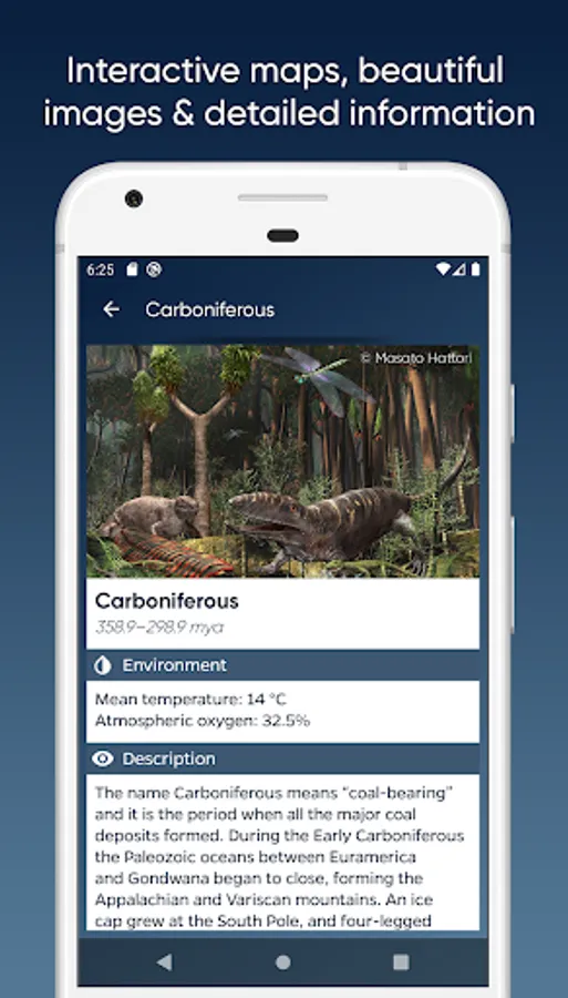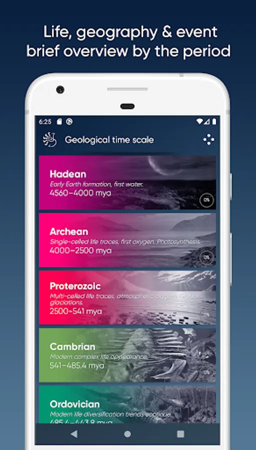 * 15 geological periods with detailed information about the most important events, interactive paleomaps, images and life form information.