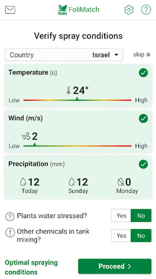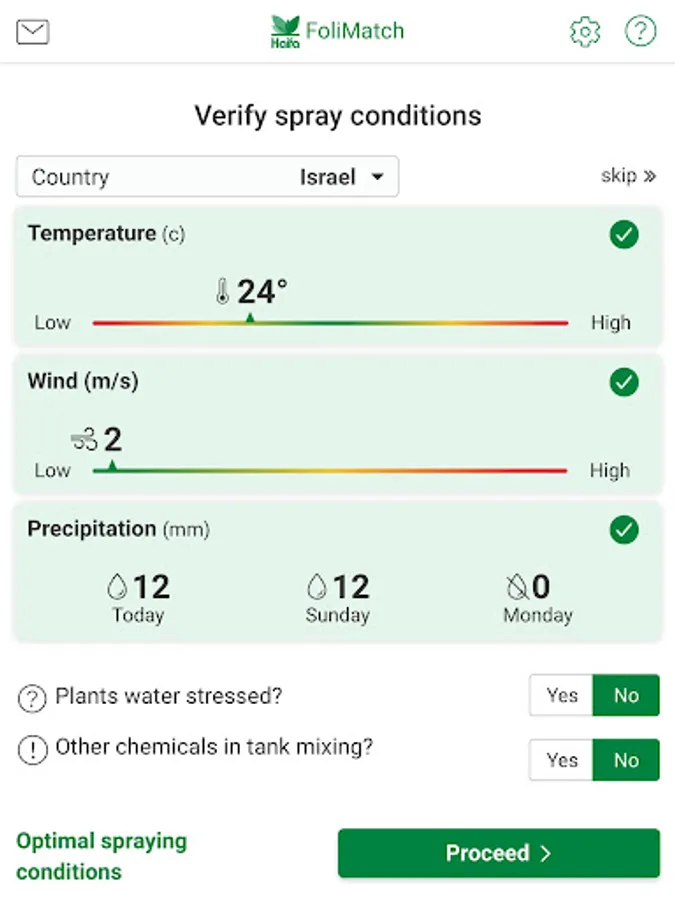 To enjoy the full capabilities of the FoliMatch™, GPS and internet connection must be enabled. This allows for the retrieval of actual temperature, wind and precipitation data. These data are weighed to provide an indication of aptness for foliar spraying: Green indicates ideal conditions; yellow indicates sub-optimal conditions; red indicates that spraying is not recommended.
