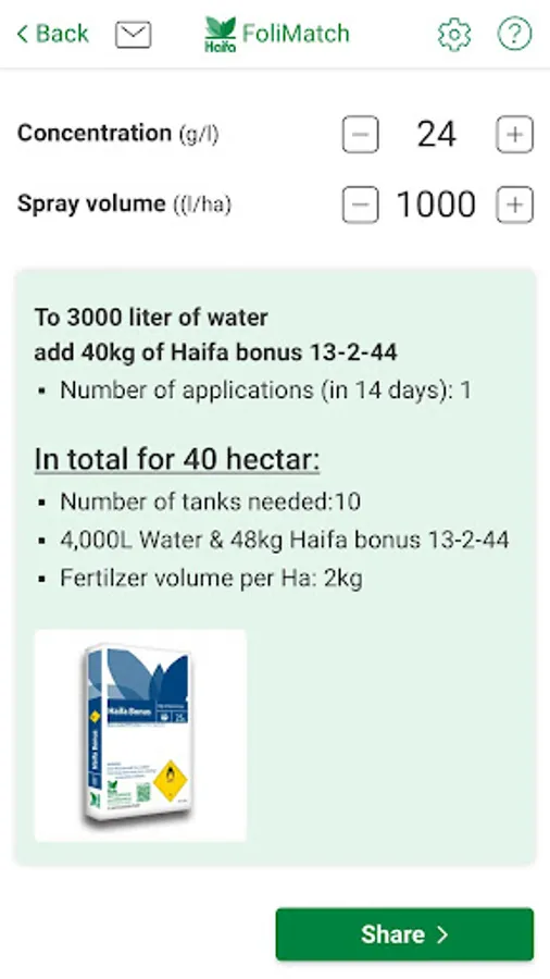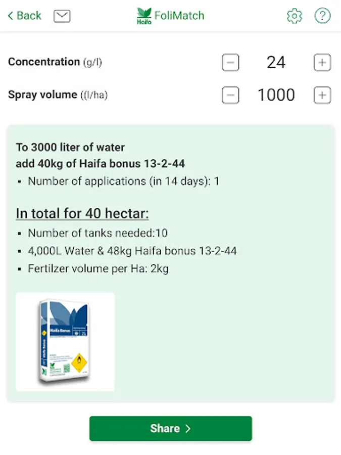 Concentration (Kg/L or Oz. / Gallon) and spray volume (L/ha or Gallon/acre) can be adjusted as needed, within the limits of Haifa's recommended volumes. The final results are adjusted accordingly