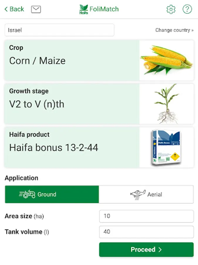 This section serves as a calculator to help you determine the amount of fertilizer needed in the tank, depending on crop type, fertilizer in use, application method, sprayed area and tank volume. For any choice of crop, only the relevant growth stages and Haifa fertilizers are selectable.