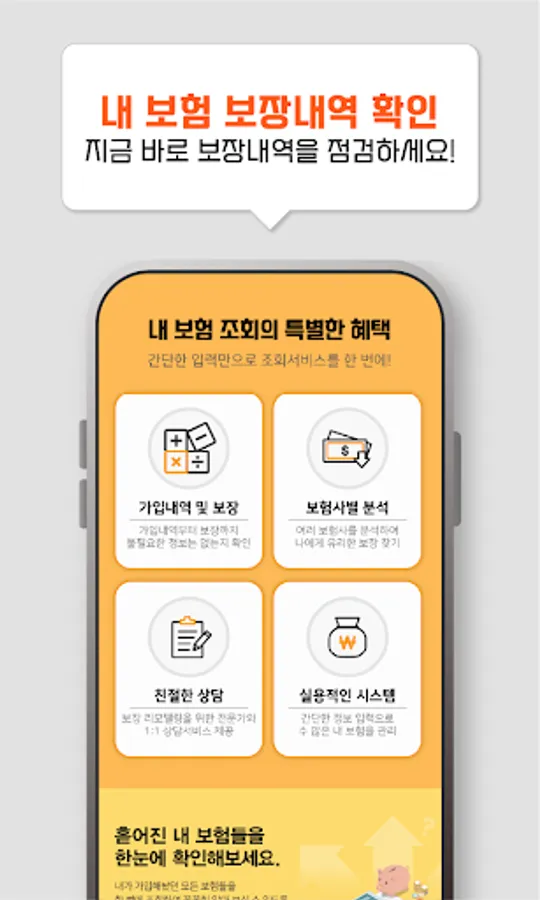 You can view and manage all of your insurances that were scattered by simply entering information. Easily check the details of insurance products you have subscribed to and guarantees, and make sure there are no unnecessary guarantees or insurance premiums. Through real-time confirmation and analysis of insurance premiums for each major insurance company, we will find an advantageous coverage for you. In addition, 1:1 customized consultation service with experts for guaranteed remodeling! Use it easily on mobile.