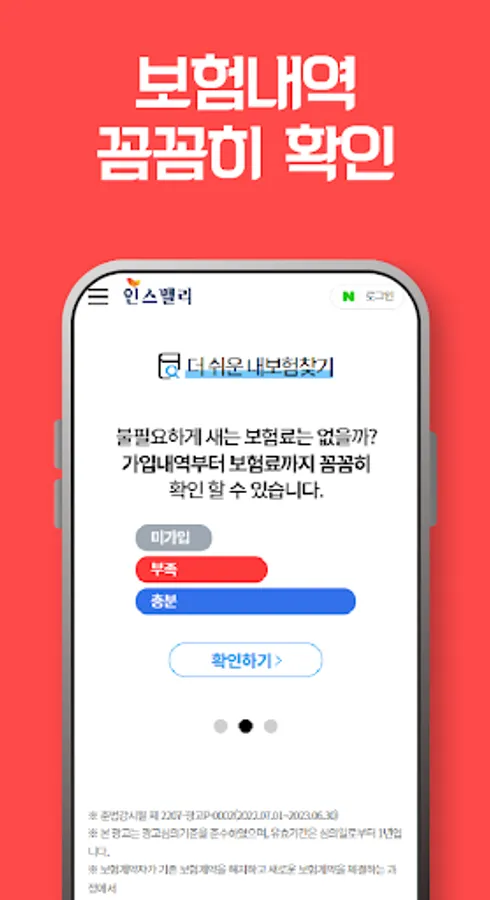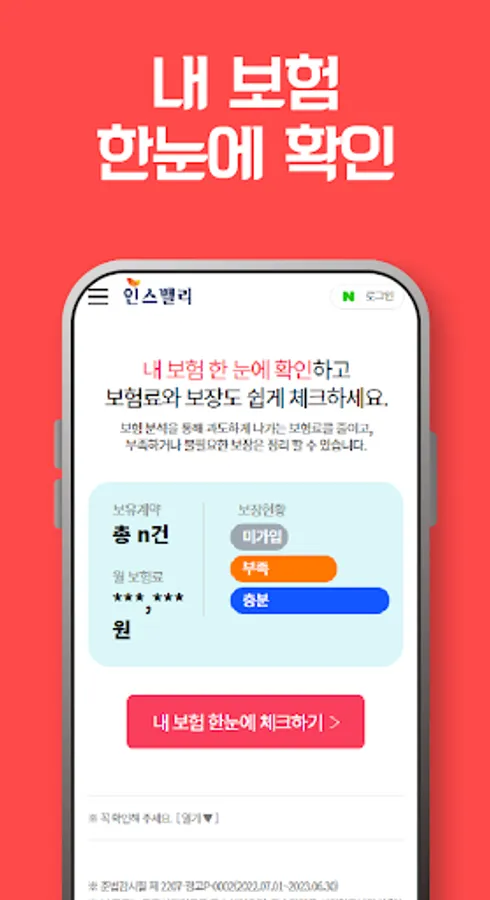Use the Find My Insurance service and carefully check everything from subscription details to insurance premiums! You can check and manage your scattered insurance at a glance with a single click. Find my insurance easier and faster by simply entering information without complicated procedures! Reduce excessive insurance premiums through insurance analysis, and organize insufficient or excessive coverage. You can enjoy all these services anytime, anywhere with your smartphone.