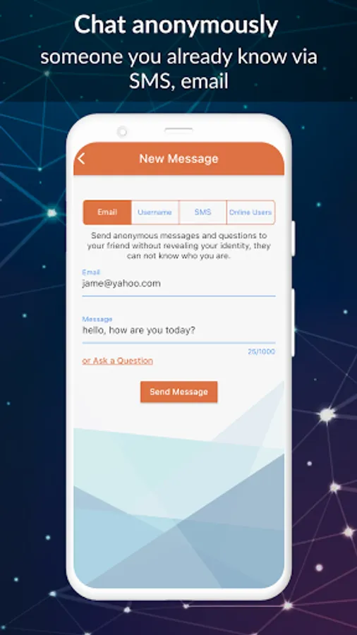 - Chat anonymously with your friends or someone you already know by email, username, or phone number.