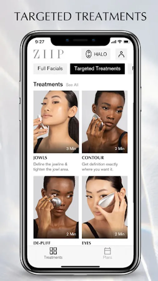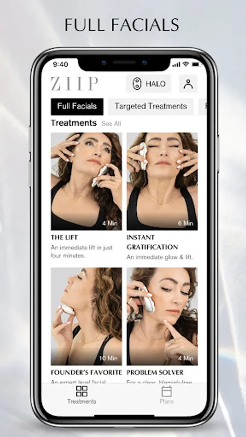 To complement the LIFT treatment that is pre-programmed on every ZIIP HALO, the ZIIP App offers a curated collection of full facials and targeted treatments, utilizing nanocurrent and microcurrent technology to give both immediate and lasting results.