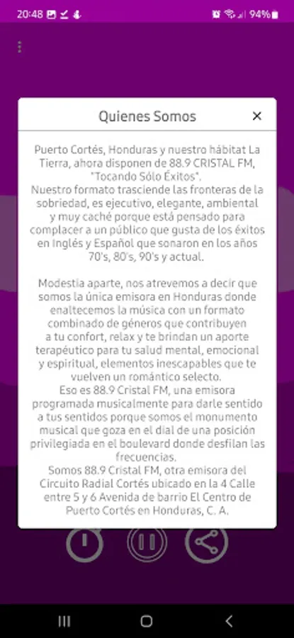 We are 88.9 Cristal FM, another station of the Cortés Radial Circuit located on 4 Calle between 5 and 6 Avenida in the El Centro neighborhood of Puerto Cortés in Honduras, C. A.