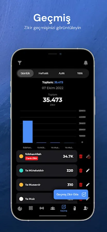 - Ability to see the daily, weekly, monthly and yearly history of Zikir.