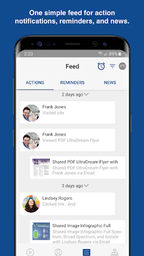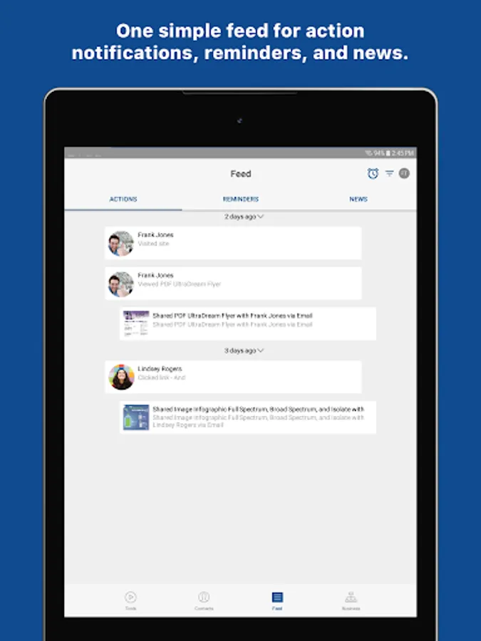 Feed: Keep track of everything you’ve shared and see what your contacts have viewed with notifications. You can even swipe notifications to mark them as a Reminder. News also brings all of the latest announcements and social posts from corporate straight to you in one convenient place!