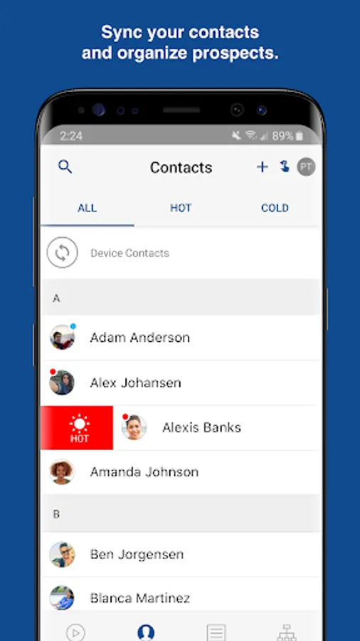 Contacts: Choose how to sync and manage your contacts. Swipe to sort them by interest level. You can make connections, add notes, or check out the Contact Feed to see the tools you've shared and contact actions.