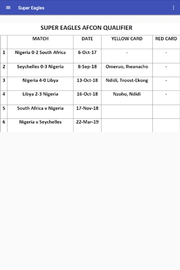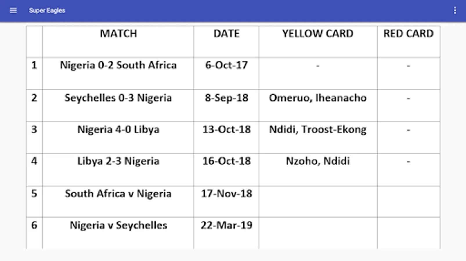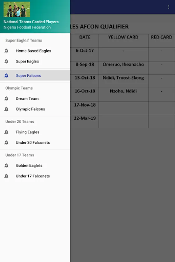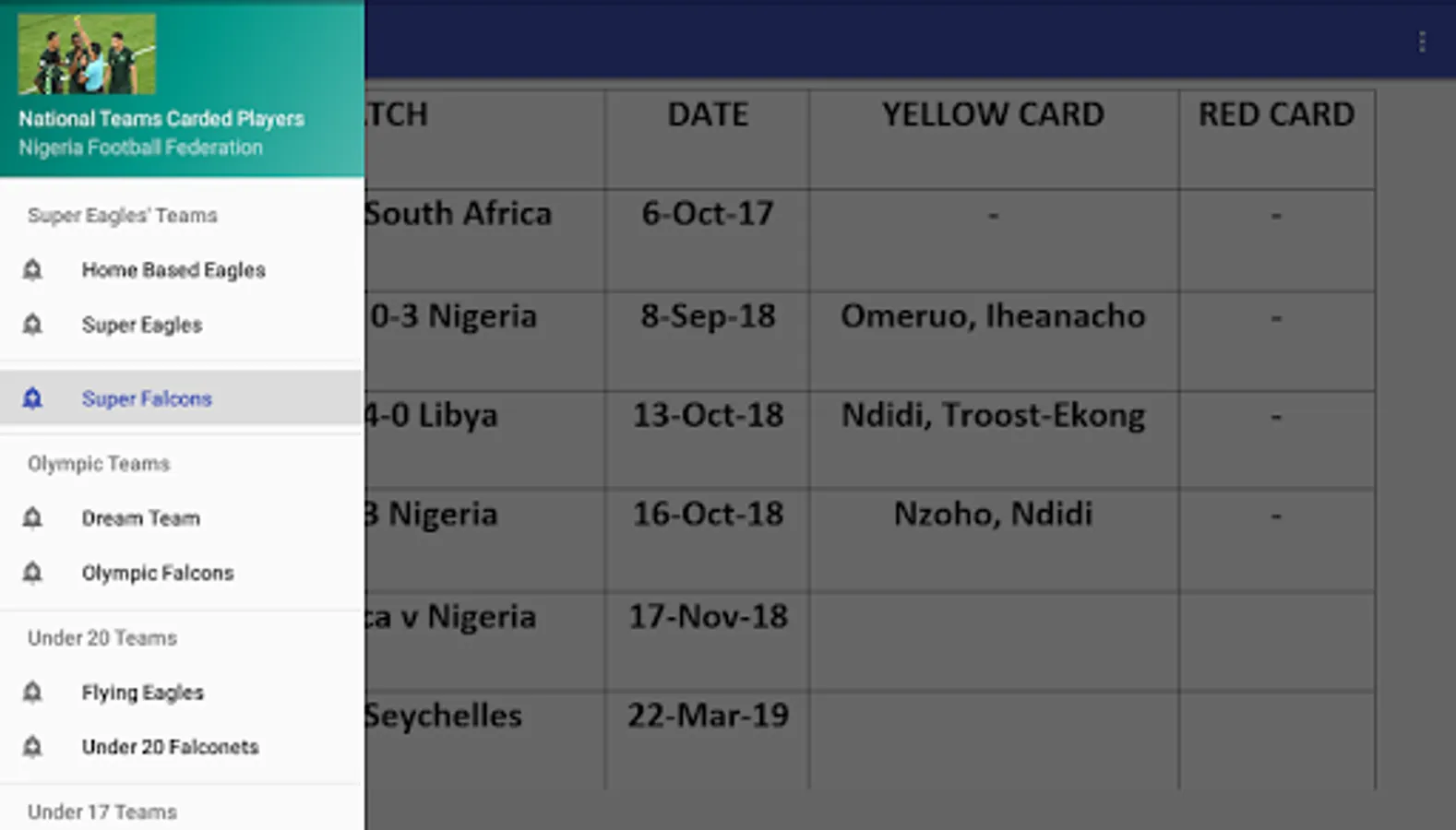 The Nigeria Football Federation awareness app for booked players during matches. It notifies match officials about the players awarded yellow and red cards in games and the players that have been suspended from matches too. This app enables officials to be intimated on the current status of booked players before football matches are played