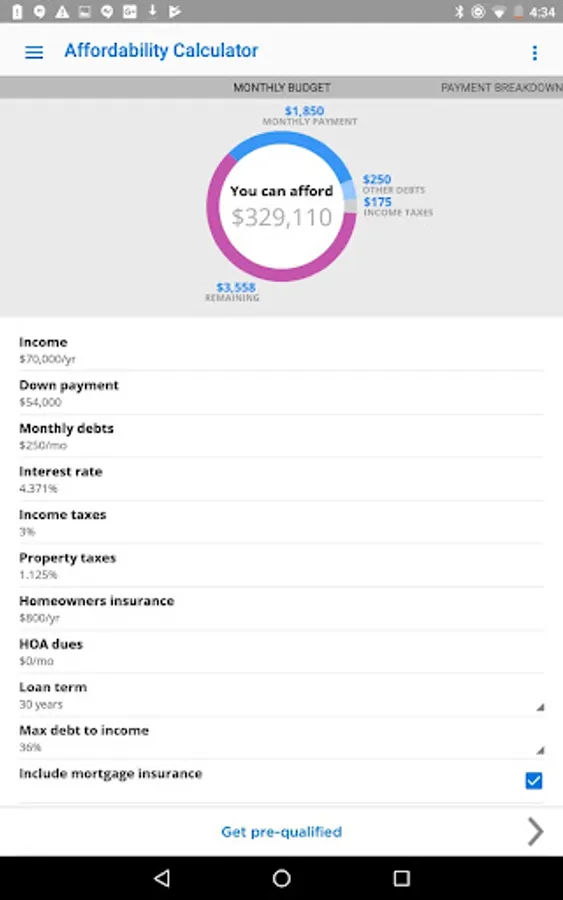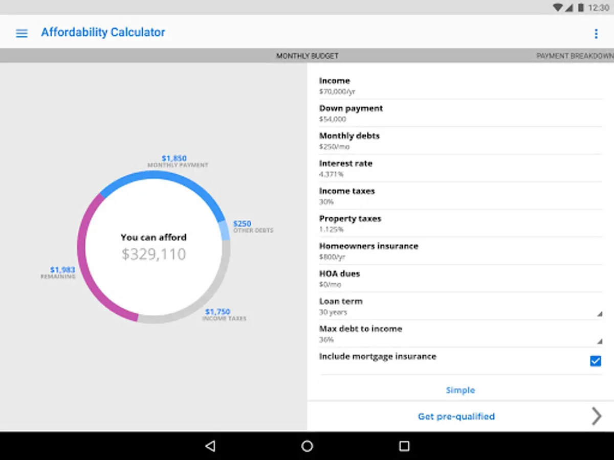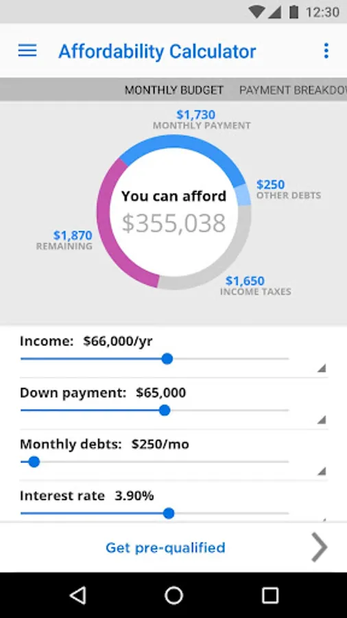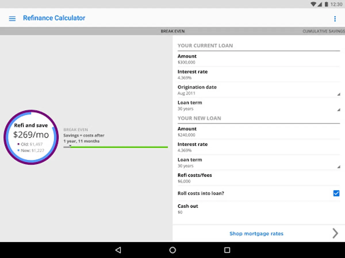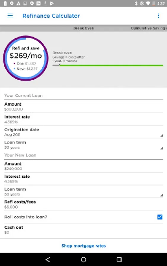 • Refinance calculator estimates your breakeven point and shows money savings over time.