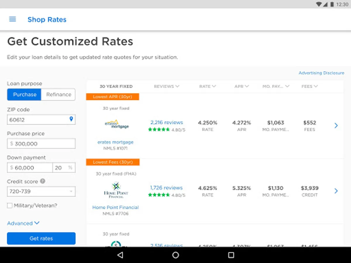• Compare mortgage rates, APRs, fees, monthly payments, loan lengths and more with customized quotes from dozens of lenders.