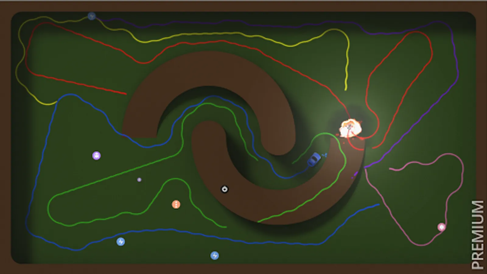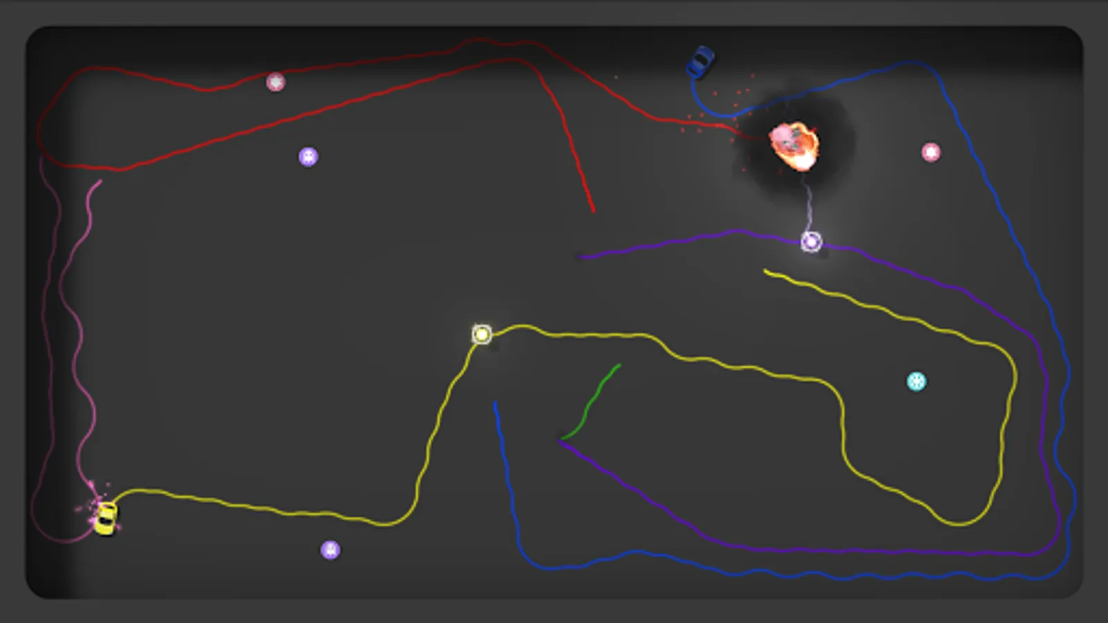 Players join in the game by creating their own button along the edge of the screen. The controls are simple: push your button to turn your car clockwise. Every car produces a line behind it which will destroy any player that touches it. Weave your way around the map to secure a safe zone or seek to cut your friends off in their tracks. Features seven unique power ups to keep you on your toes.