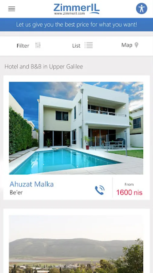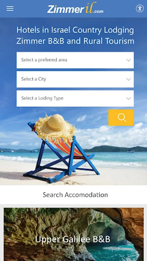 ZimmerAPP show you the best accommodation in Israel: Zimmers (rooms) in the Kibbutz and the Village (Country Atmosphere), Villas, Cabins, Chalet, Suites, cheap hotels, luxury Hotels, Motor karavan, Campground, youth hostels, Field schools etc...