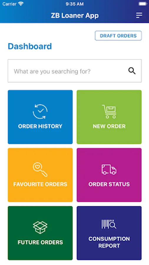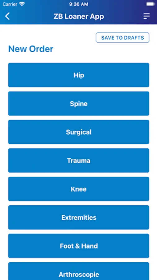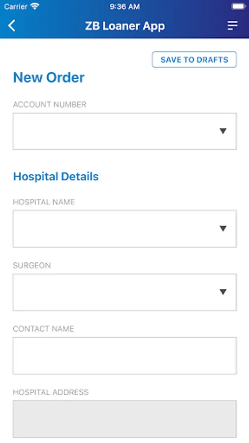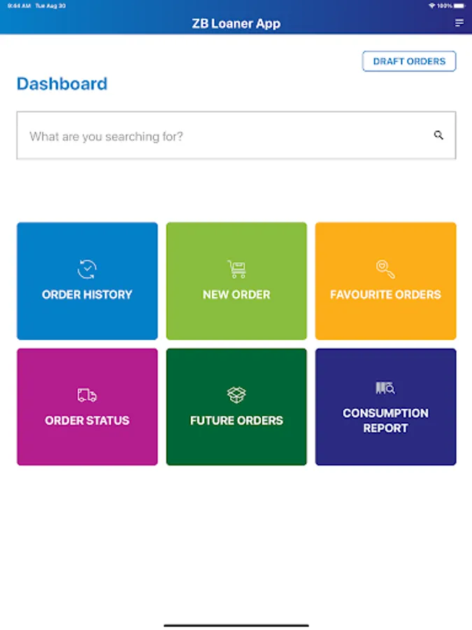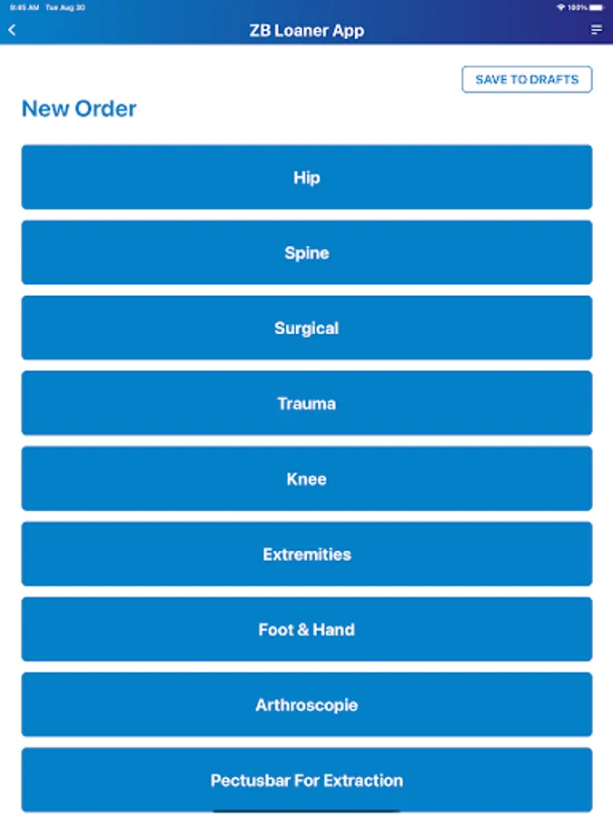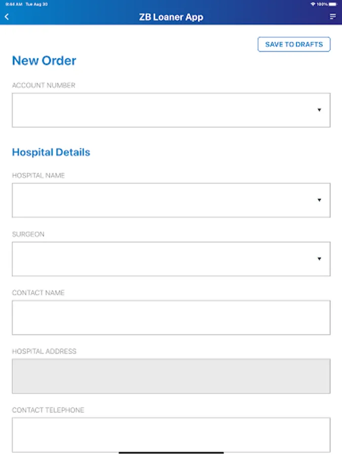 ZB Loaner App, from Zimmer Biomet, will streamline the process of identifying and ordering tools used in medical procedures involving Zimmer Biomet's products. This app takes sales representatives through a decision tree process which results in generating a notification to customer service containing the data required for the order.