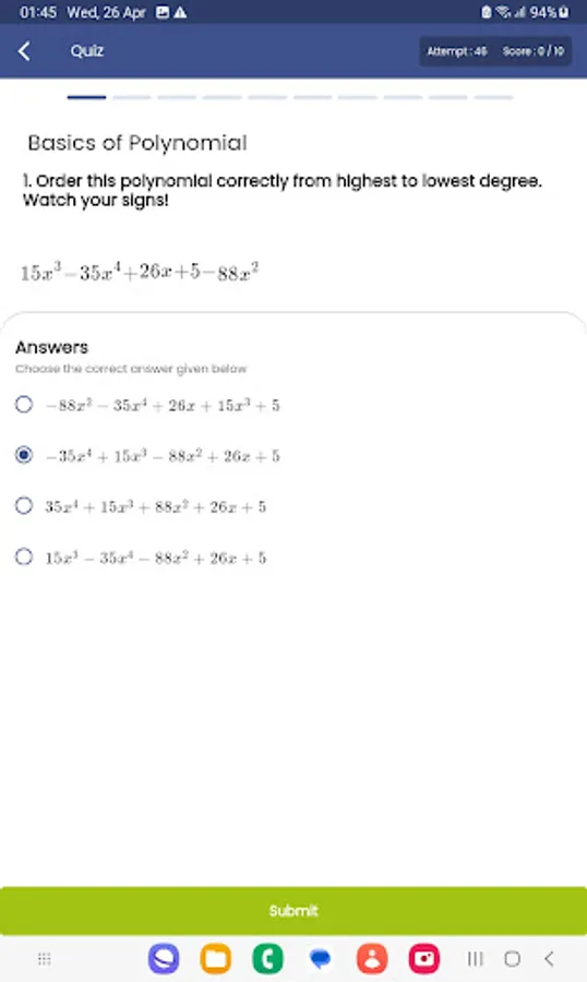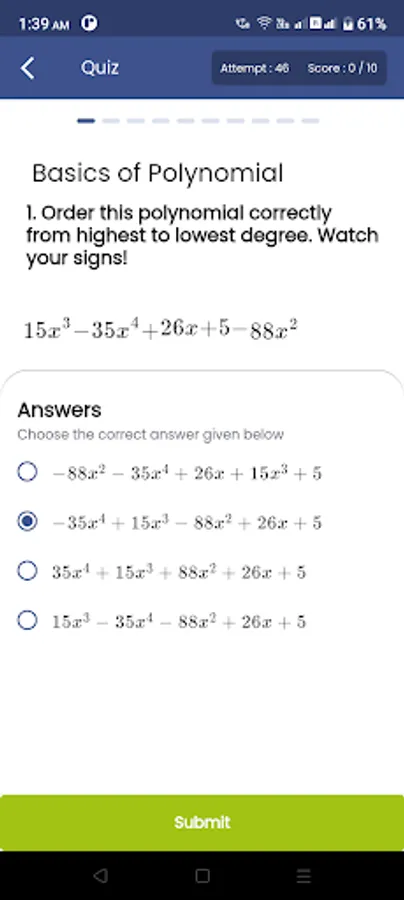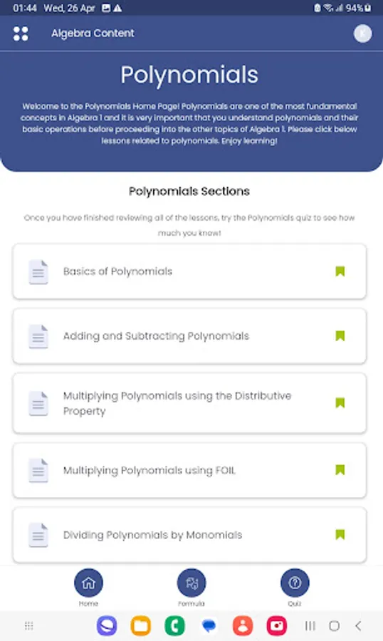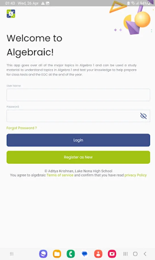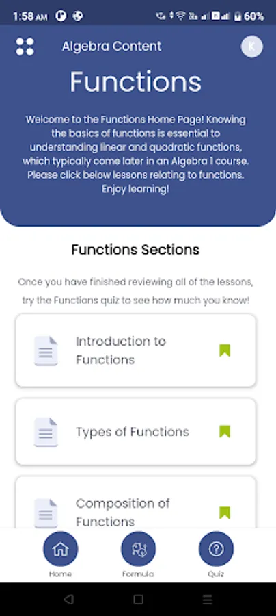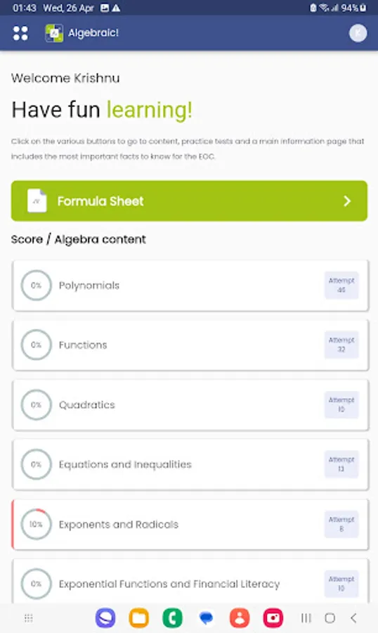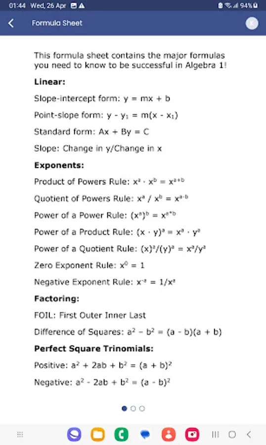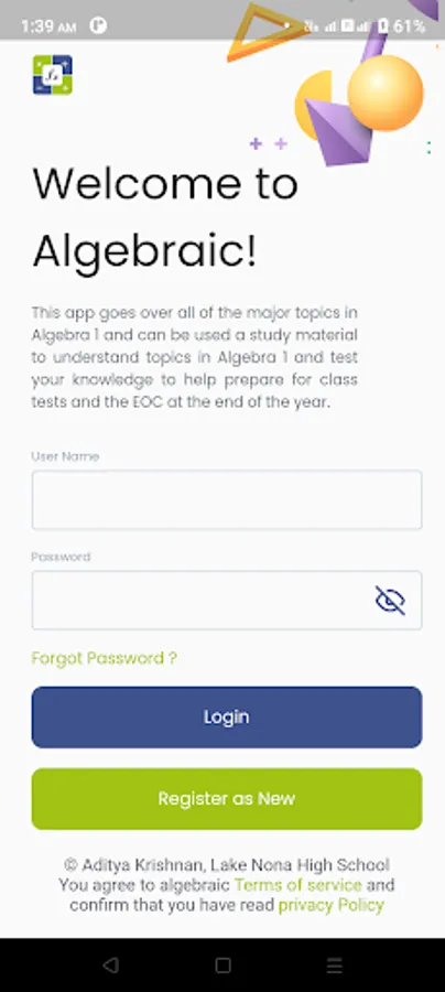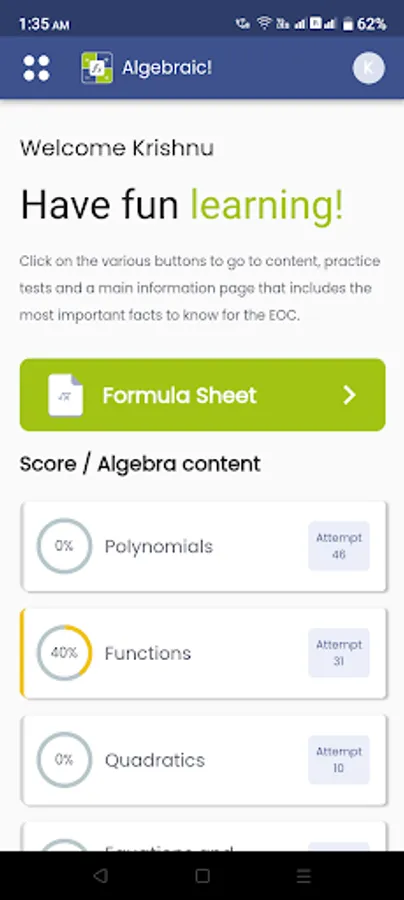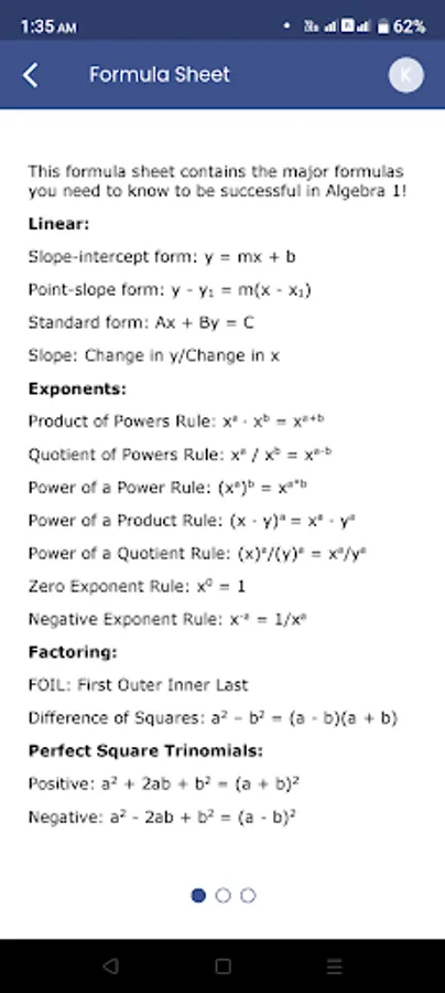 This app goes over all of the major topics in Algebra 1 and can be used a study material to understand topics in Algebra 1 and test your knowledge to help prepare for class tests and the EOC at the end of the year.