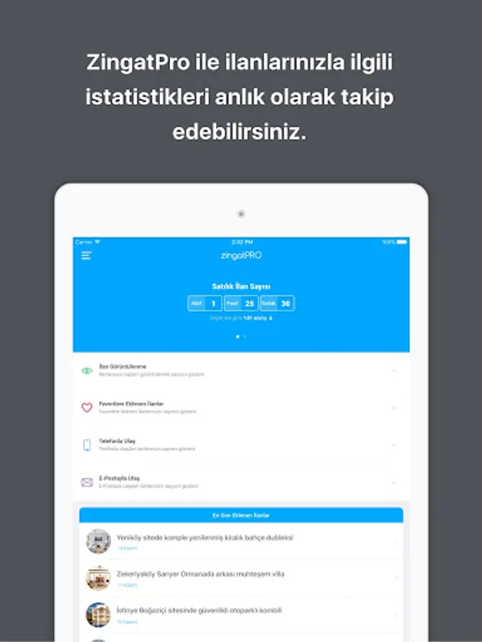 • You can follow the statistics about your real estate ads instantly. How many people viewed your ads? How many people have added your ad to their favorite list? How many ads were contacted? You can quickly access data such as