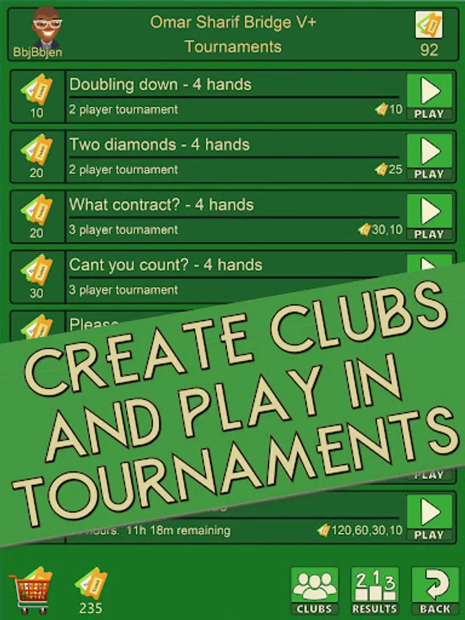 In Tournament Bridge you play at your own pace against players from around the world in duplicate style Bridge tournaments. Each player in a tournament plays the same hands with the winner scoring the most points. Alternatively you can easily create your own online Bridge club, invite your family, friends or even some enemies then play in duplicate style Bridge tournaments against your own select set of players.