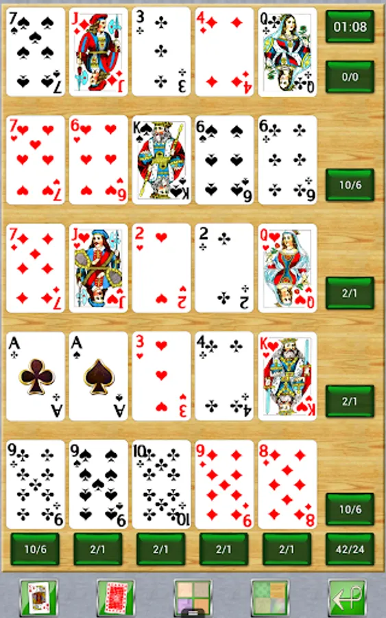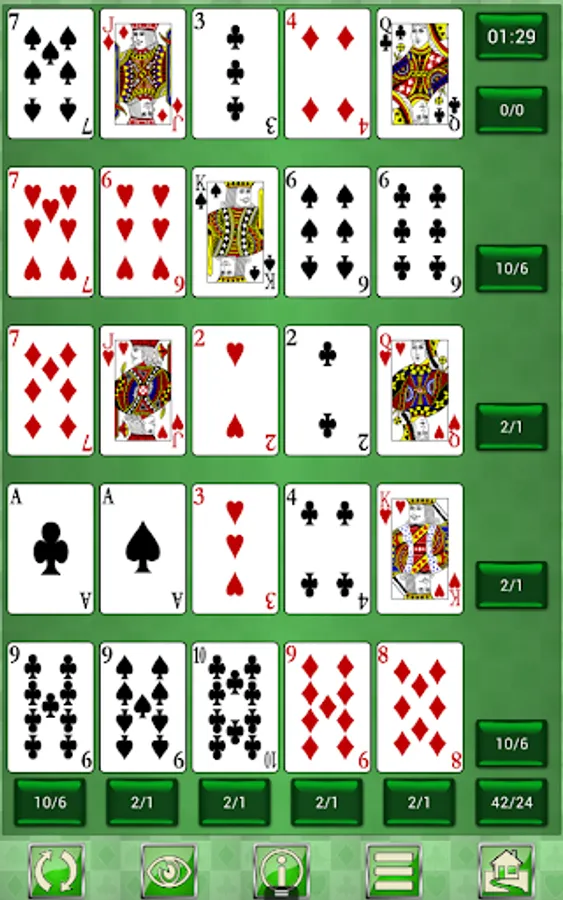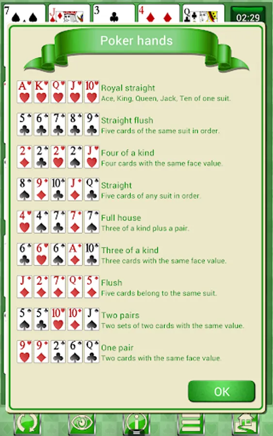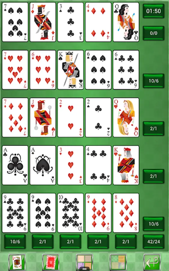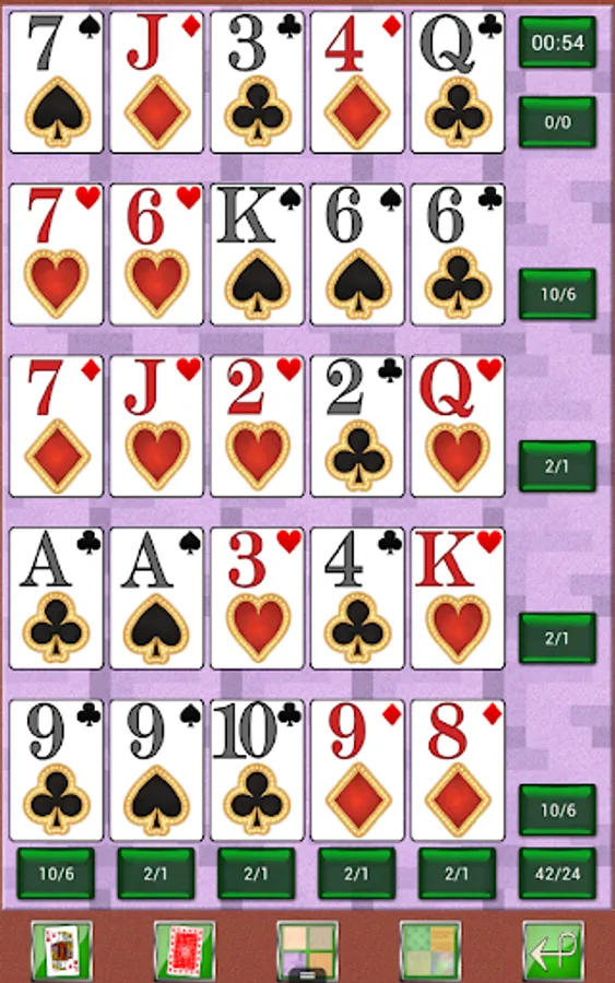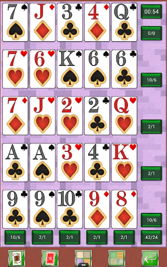 Thirty five cards are dealt to a square of five rows and five columns. Your task is to simply rearrange the cards into as many different poker hands as possible. The better the poker hand, the higher you score.